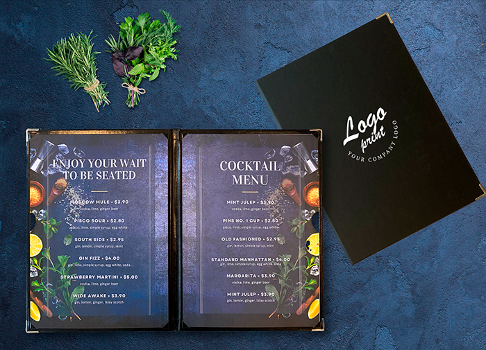Menu omslagene kan også bestilles i en variant med eget design/logo -tryk.