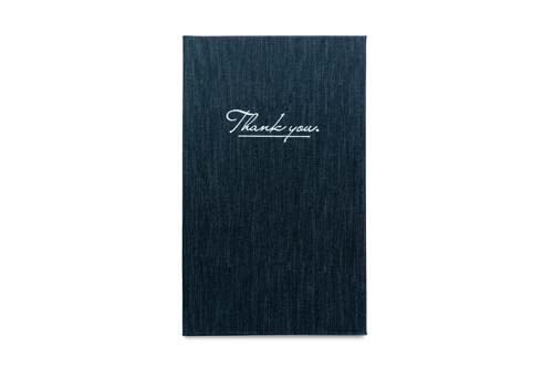 Produktinformation: Selvom det nogle gange kan føles som et anspændt og ubehageligt øjeblik at præsentere regningen, er det en fantastisk mulighed, for at gøre dine gæster til loyale kunder. Byt den velkendte tallerken, ud til denne stilfulde kashmir “THANK YOU” regningsholder. Cover materialet er en tekstureret Kashmir PU, der giver en dejlig fornemmelse af stof, med et nedtonet “THANK YOU” sølvprint på forsiden. Det ideelle valg til moderne barer og restauranter, der foretrækker et luksuriøst naturligt look. Perfekt i kombination med matchende menuholdere, ringbind og bordskilte.